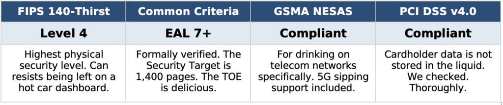 “We evaluated hundreds of products for security,” said an atsec spokesperson, “and frankly, most popular energy drinks had unacceptable threat surfaces. Predictable carbonation patterns. Unauthenticated flavor delivery. Ingredients with no entropy whatsoever. We decided the market needed disruption.”1