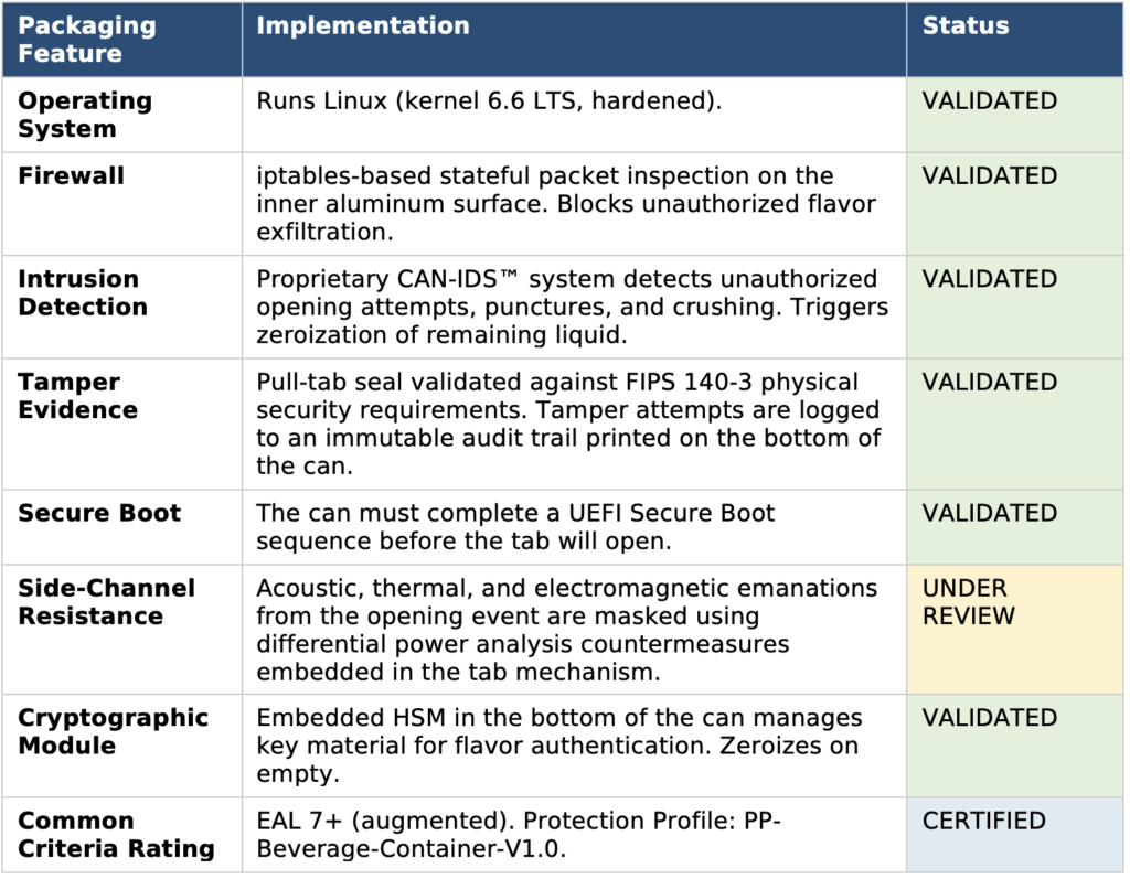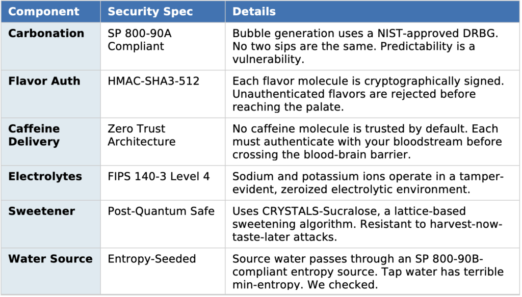 “We evaluated hundreds of products for security,” said an atsec spokesperson, “and frankly, most popular energy drinks had unacceptable threat surfaces. Predictable carbonation patterns. Unauthenticated flavor delivery. Ingredients with no entropy whatsoever. We decided the market needed disruption.”1